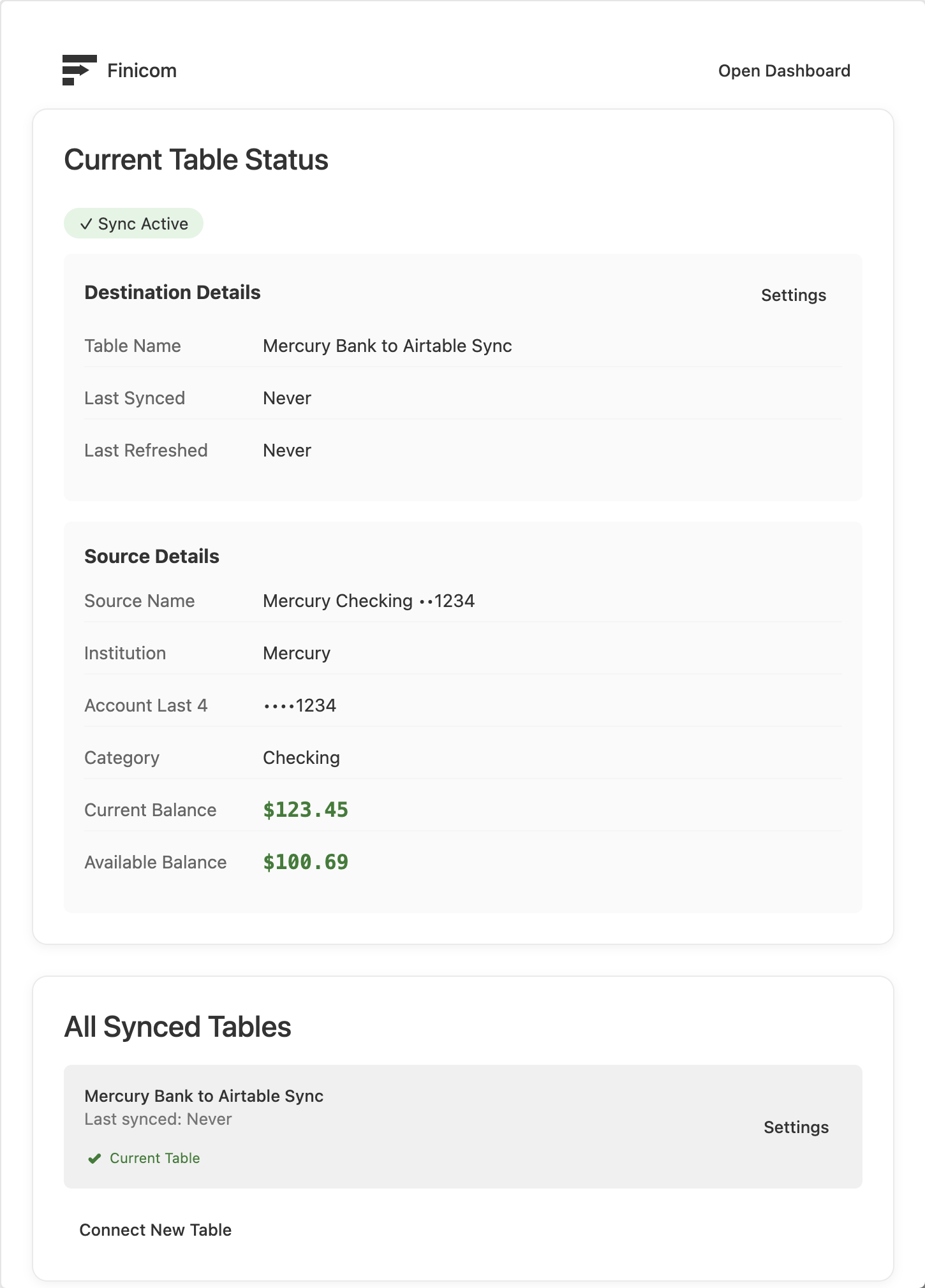 The Finicom Airtable Extension allows you to view and monitor your bank transaction data from Finicom directly within your Airtable bases. This integration makes it easy to reference your financial data while working in Airtable, providing a seamless experience for tracking expenses and monitoring cash flow.