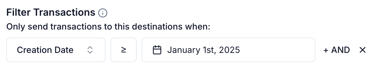 - If you need to apply a date filter to an already-synced destination, it's best to create a new destination syncing to the same location, then appply a new filter before any transactions are synced.