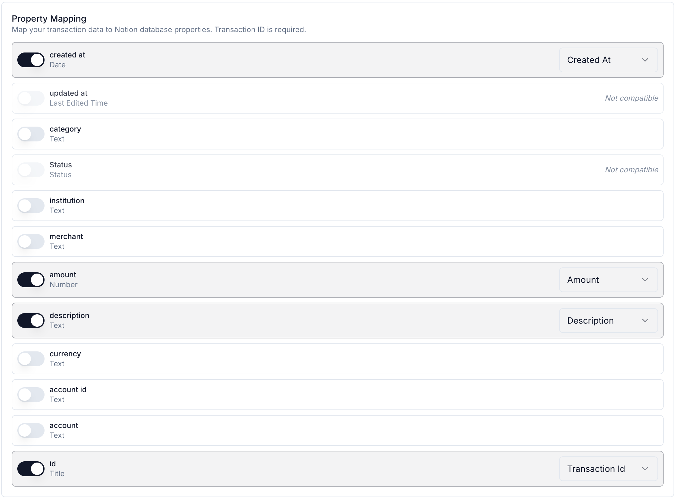 Finicom allows you to customize which pieces of transaction data are sent to specific Notion database properties so that you can control how your financial data is populated into your Notion database.